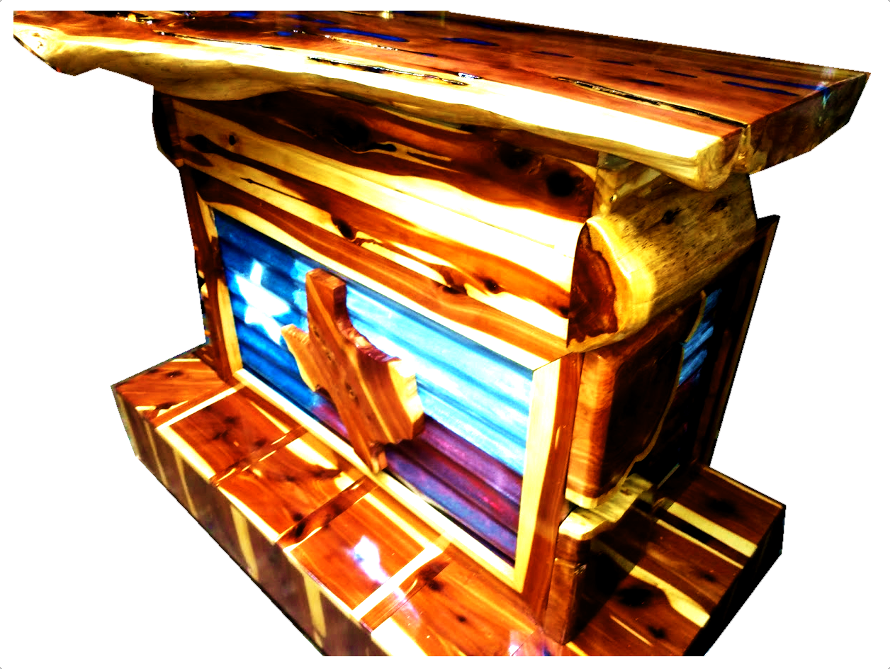 A live-edge, cedar fireplace mantle​ made from a cedar tree trunk with a high gloss, epoxy resin finish on the shelf surface.